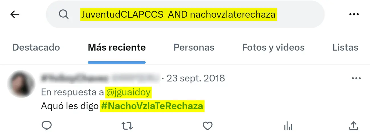 Para investigar si la cuenta @JuventudClapCcs en Twitter había estado involucrada en la etiqueta #NachoVzlaTeRechaza en contra del cantante, se realizó una búsqueda con operadores que permitieran encontrar tweets que contuvieran tanto el hashtag como el nombre de usuario de la cuenta suspendida.
