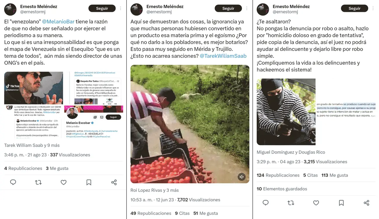 La intención de generar daño con el uso de acusaciones desproporcionadas se hizo evidente en un tweet que Meléndez publicó el 4 de agosto de 2023. En él sugirió que, en lugar de reportar robos o asaltos según la figura legal correspondiente, deberían ser denunciados ante las autoridades como «homicidio doloso en grado de tentativa». El tweet concluyó con la frase: «¡Compliquemos la vida a los delincuentes y hackeemos el sistema!» y etiquetó directamente a las cuentas en Twitter de Douglas Rico, director del Cuerpo de Investigaciones Científicas, Penales y Criminalísticas (CICPC), y a Miguel Domínguez, comandante de la Dirección de Acciones Estratégicas del Cuerpo de Policía Nacional Bolivariana (PNB).