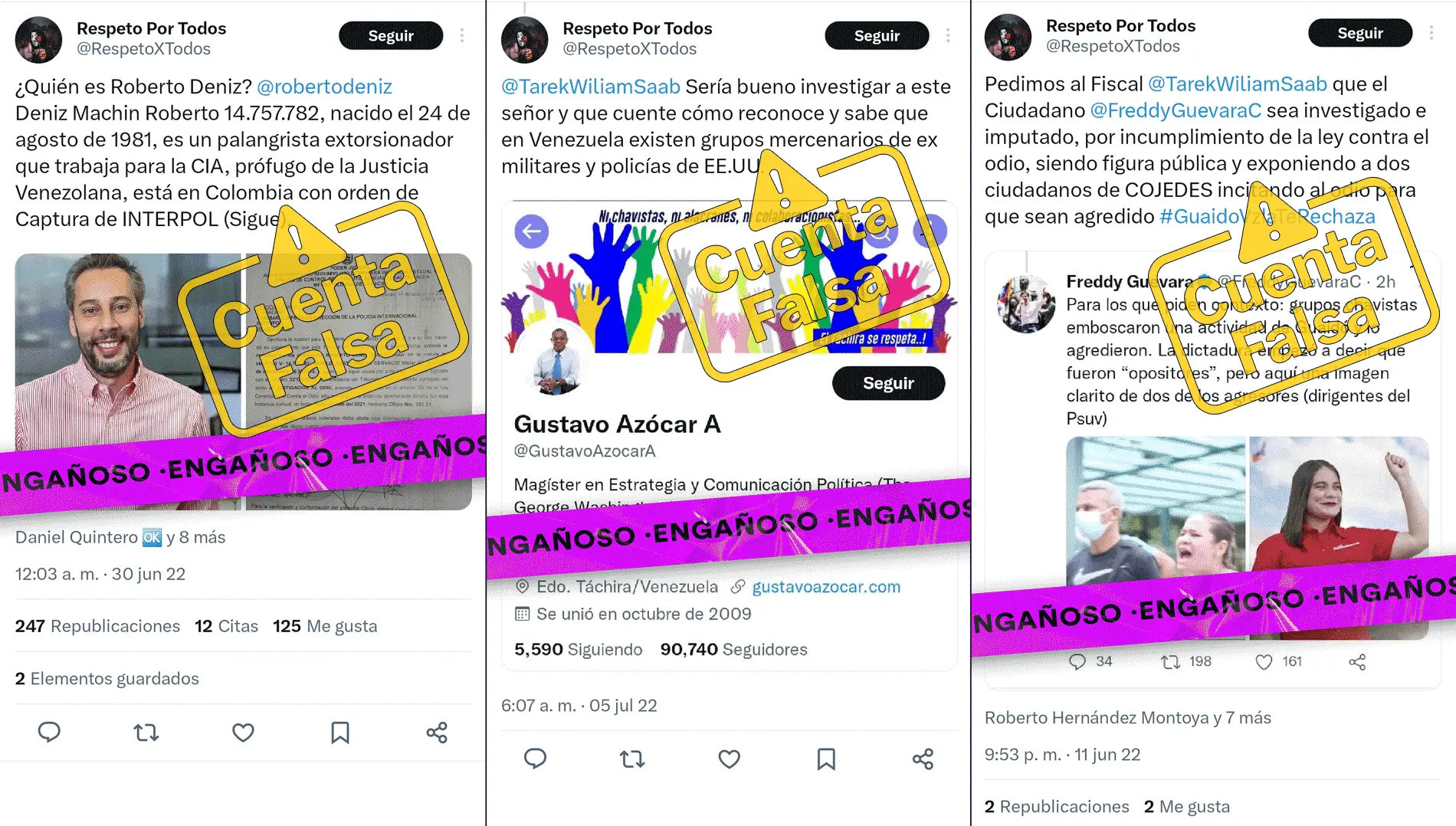 El 30 de junio de 2022, @RespetoXTodos lanzó un hilo en el que acusaba a Roberto Deniz, periodista del medio venezolano Armando.info, de ser un «palangrista extorsionador que trabaja para la CIA«. El usuario compartió un falso organigrama de una red de extorsión supuestamente liderada por Deniz, que incorporaba a periodistas de otros medios y organizaciones venezolanas, incluida Cazadores de Fake News. Estos ataques de estigmatización contra Deniz han sido documentados por la organización desde septiembre de 2021 y se insertan en el contexto de una operación de influencia a favor de Alex Saab y en contra de los periodistas que han investigado su caso.