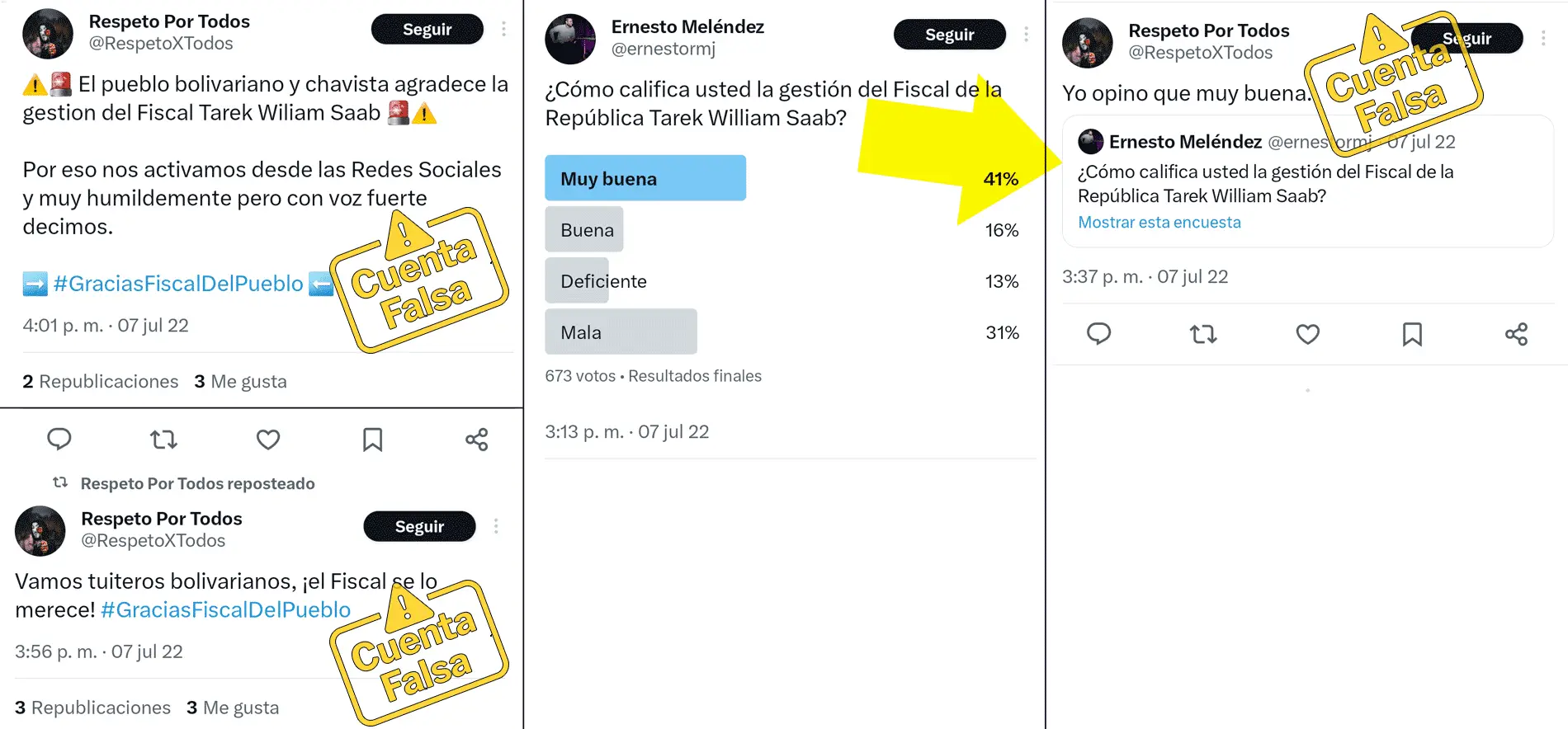 El 7 de julio de 2022, un día después de la declaración del fiscal general Tarek William Saab acusando a «Mayi» Cumare de haber orquestado el asesinato de su esposo Carlos Lanz, Ernesto Meléndez intentó impulsar la etiqueta #GraciasFiscalDelPueblo en Twitter usando @RespetoXTodos, pero sin mucho éxito. En su cuenta principal (@ernestormj) publicó una encuesta sobre la gestión de Saab y poco después, usó a la cuenta anónima @RespetoXTodos para citar la encuesta publicada por su otra cuenta, y comentar «Yo opino que muy buena«.