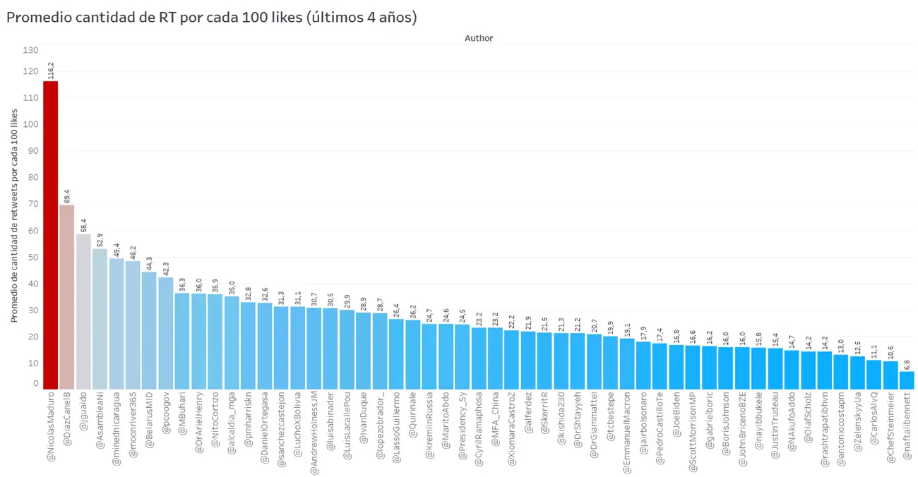De acuerdo a la medición, realizada en abril de 2022, la cuenta @NicolasMaduro acumula un promedio de 116,2 retweets por cada 100 likes (o «me gusta») recibidos, un promedio anómalo con respecto a cualquier cualquier otro gobernante en el mundo (incluyendo a todos los gobernantes y presidentes de América), cuyos valores promedios inferiores a 60 retweets por cada 100 likes, casi la mitad. Miguel Díaz-Canel, líder del gobierno de Cuba, está en segundo lugar, con 69,4 retweets por cada 100 likes en promedio.