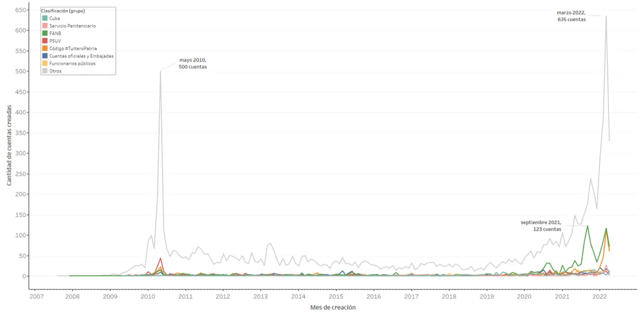 - Septiembre de 2021 y enero de 2022: meses de creación de gran cantidad de cuentas del Grupo 2 (FANB). En ambos meses también hay picos de creación de cuentas del Grupo 8 («Otras cuentas»). En enero de 2022, por ejemplo, se crearon 37 cuentas del Grupo 2 y 118 cuentas del Grupo 8 que retuitearon a @NicolasMaduro. Algunas de estas 118 cuentas pueden pertenecer a operadores relacionados con la FANB, pero es imposible clasificarlos por falta de información.
