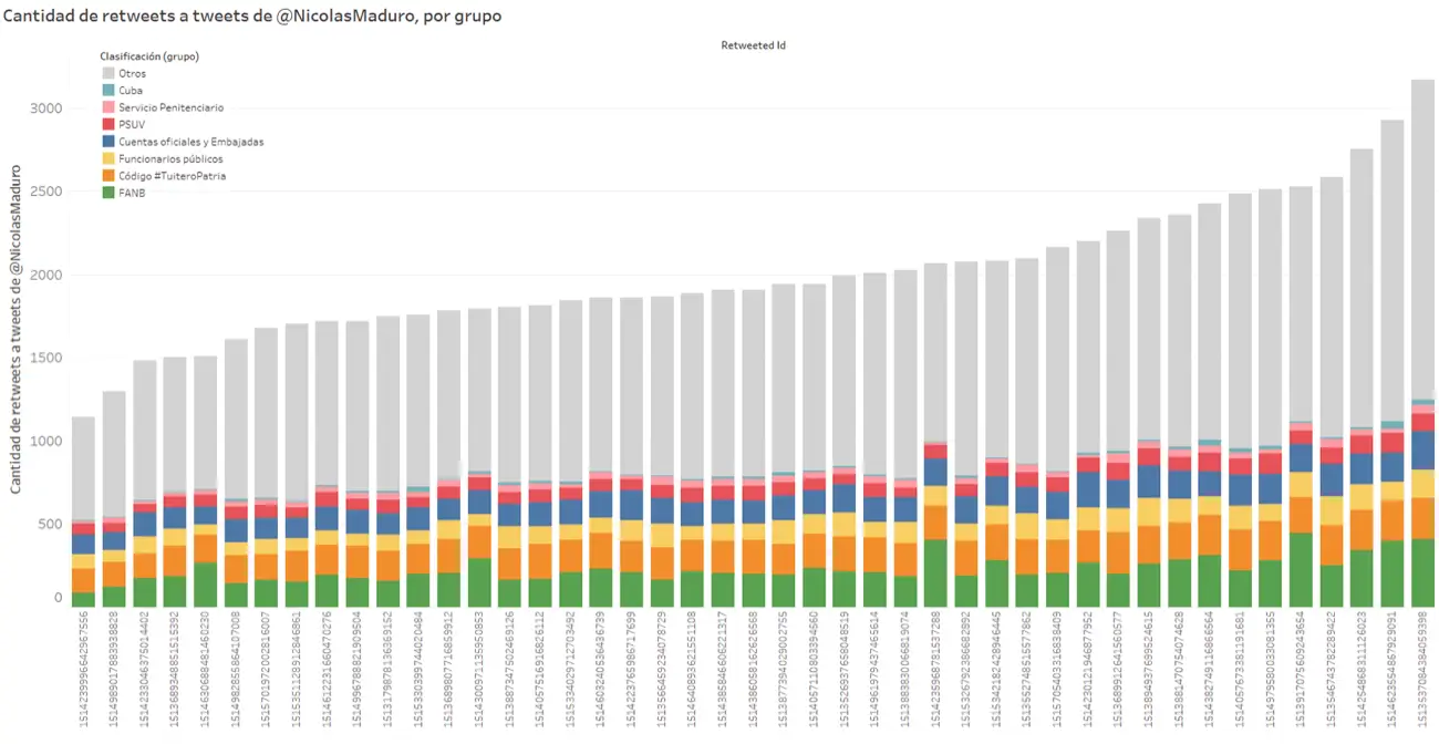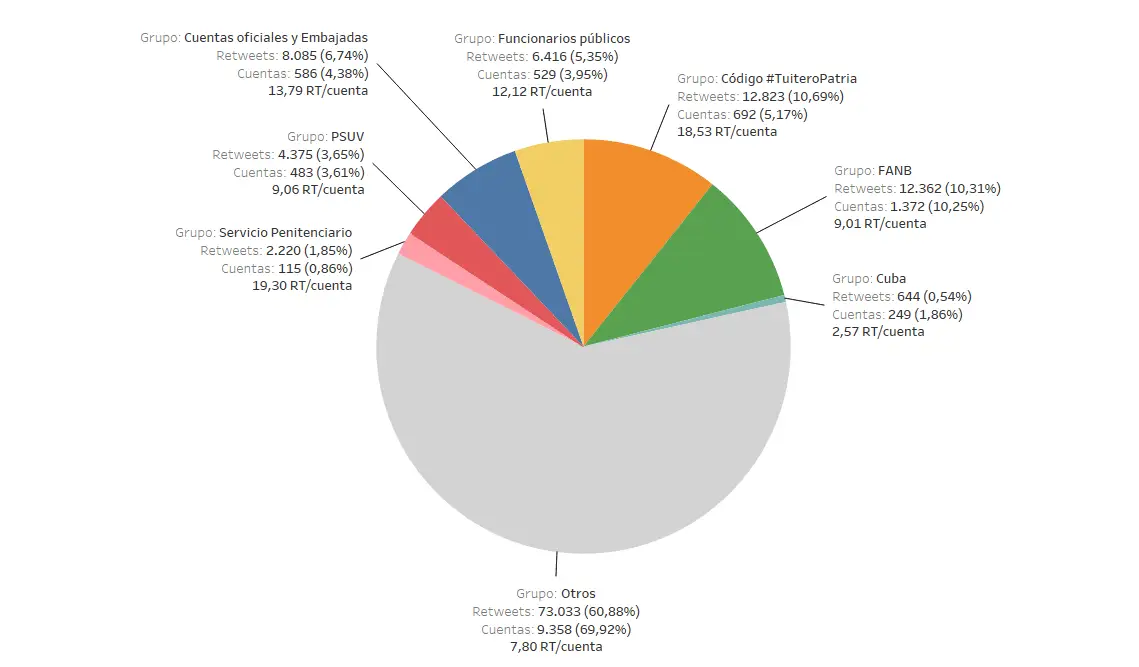 Los grupos que incluyen cuentas que publicaron la etiqueta #TuiteroPatria, cuentas asociadas con las FANB, funcionarios públicos (incluyendo las cuentas asociadas al Ministerio de Servicio Penitenciario) y cuentas oficiales y embajadas, sumaron más del 20% de los retweets realizados a @NicolasMaduro.