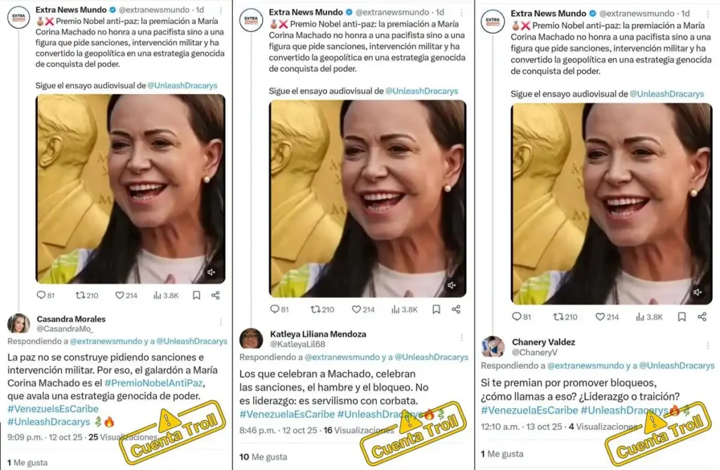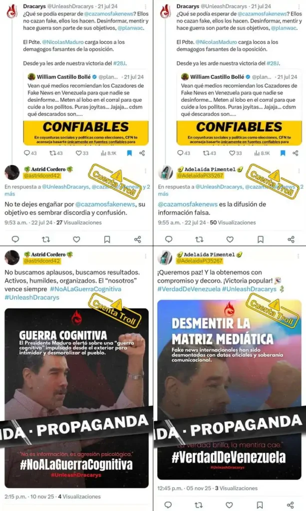 En ambos episodios, los mismos funcionarios de la Dirección de Medios Digitales del Mippci recurrieron a la misma técnica: el uso de perfiles falsos que aparentan ser usuarios comunes. En 2024 emplearon cuentas falsas para hacer campaña a favor de Nicolás Maduro y difundir desinformación electoral, y en 2025 repitieron la misma técnica para amplificar propaganda encubierta y desinformación en la misma plataforma, con la diferencia de que actualmente está bloqueada en Venezuela por decisión del propio gobierno.