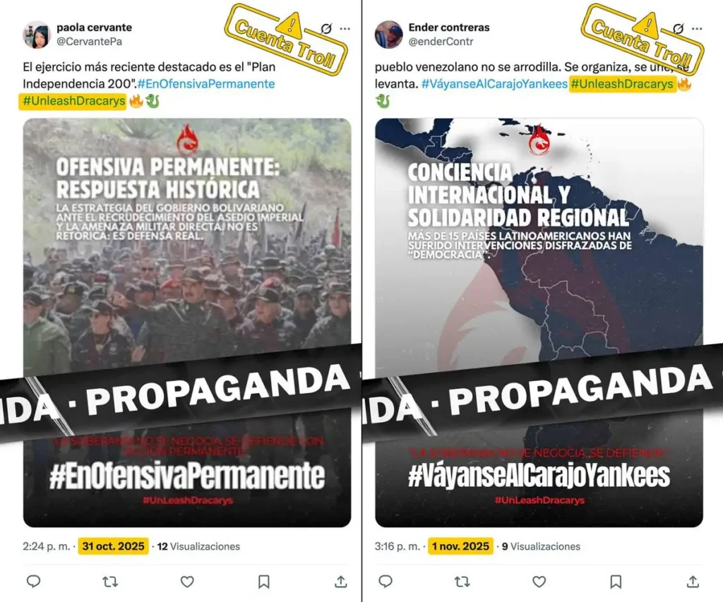 Un patrón recurrente en las publicaciones compartidas por esta red de cuentas es el uso de la etiqueta #UnleashDracarys, asociado a la operación de información vinculada al Mippci, y a las campañas de etiquetas “no oficiales” impulsadas por funcionarios de dicho ministerio.
