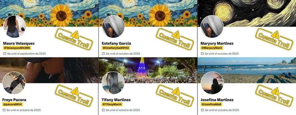 El análisis también reveló casos de duplicación exacta: las cuentas @EstefanyGa90152 y @MaryuryMar2 comparten la misma foto de perfil. Otras dos cuentas, @VelasquezM4306 y @EstefanyGa90152, utilizan la misma imagen de fondo con un paisaje de girasoles.