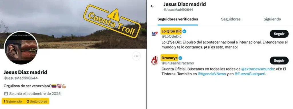 Un caso que ilustra este patrón es la cuenta @JesusMadri90644, identificada como «Jesús Díaz Madrid», creada el 22 de septiembre de 2025. Esta cuenta tenía solamente 2 seguidores: la cuenta suspendida Dracarys y @LoQSeDic, la antigua cuenta oficial del Mippci que cambió de nombre. Además, el perfil no registra publicaciones propias, sólo 68 reposteos exclusivamente de contenido de Dracarys y otras cuentas de propaganda “no oficial”, como la de la Agencia Venezuela News y la de Extra News Mundo.