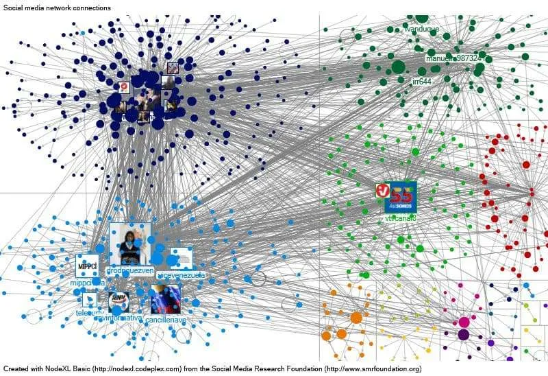 En la gráfica de la red de cuenta de Twitter analizadas se pueden observar al menos siete nubes de puntos (clústers) bien definidas. En orden de influencia, son: