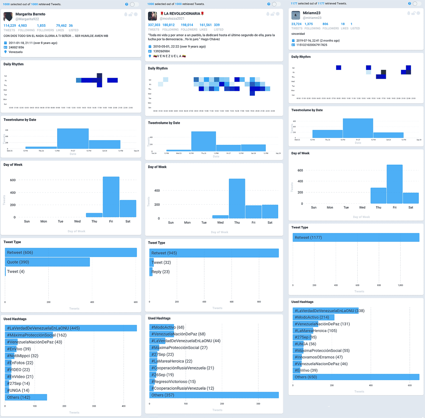 Por ejemplo, en la siguiente tabla se muestra que la cuenta @Margarita922 publicó más de 600 tuits el 27 de septiembre, @mcolozza2021 publicó más de 500 tuits el jueves 26 y @miriamn23 publicó más de 600 tuits el 27 de septiembre. Esta última cuenta retuiteó 448 veces el hashtag #LaVerdadDeVenezuelaEnLaONU de 5 a 6 de la tarde, un comportamiento típico de cuentas troll. @miriamn23 en cambio publicó 1177 retuits, a lo largo de no más de 9 horas entre el 26 y el 28 de septiembre, llegando a publicar 448 tweets solamente en un intervalo de una hora, de 5 a 6 pm el viernes 27 de septiembre. Este comportamiento, sin lugar a dudas es deliberado y atenta contra las políticas de la red social.