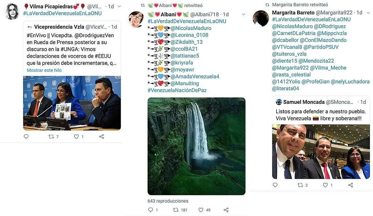 Con el uso de herramientas gratuitas de análisis de tendencias en Twitter, Cazadores de Fake News examinó la dinámica con la que este hashtag fue impulsado hasta convertirlo tendencia en la red social, logrando determinar que, al igual de la mayoría de las tendencias impulsadas por el régimen de Nicolás Maduro, el hashtag fue posicionado sistemáticamente por medios del estado, redes de influencers y de trolls (cuentas ficticias, administradas por operadores humanos), para generar impacto y aparentar un gran apoyo popular –inexistente en la realidad– a la intervención de Delcy Rodríguez, vicepresidenta del régimen, en la plenaria de las Naciones Unidas.