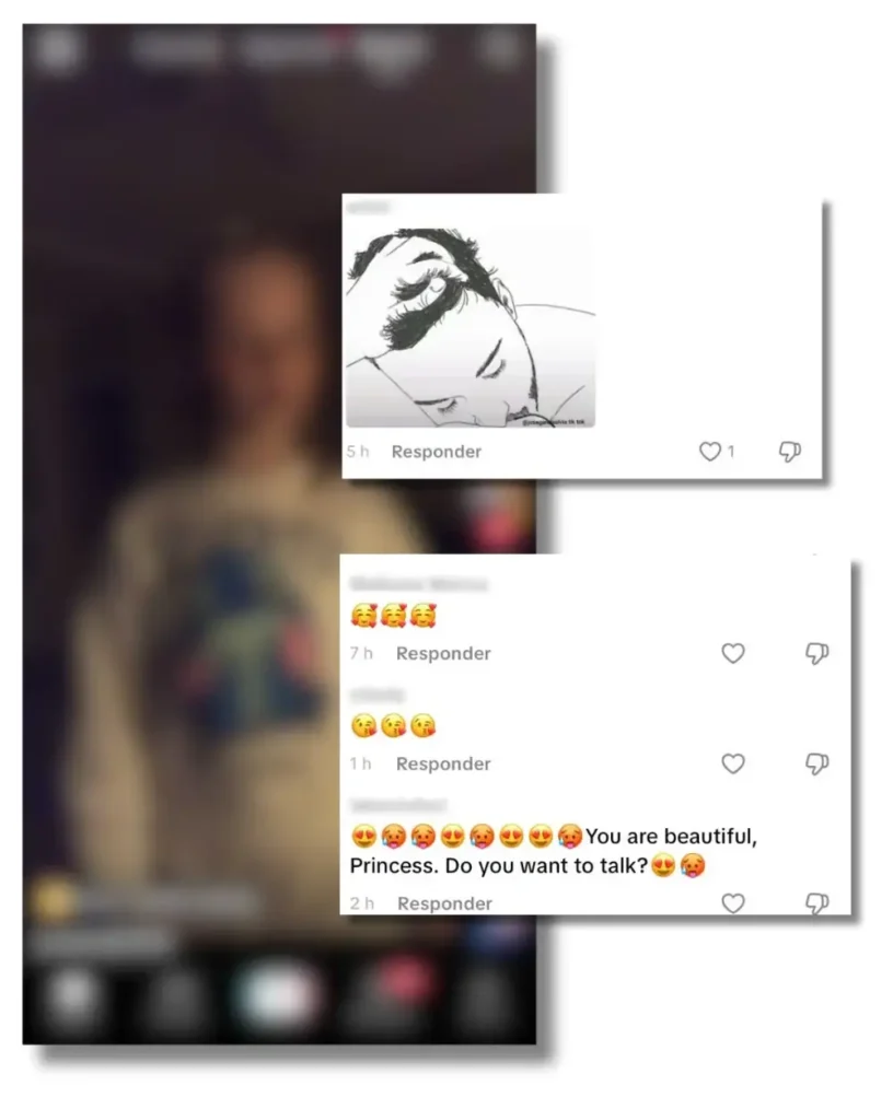 En varias ocasiones el algoritmo le enseñó a Pepe perfiles que parecían pertenecer a menores reales. Es el caso de un vídeo que nos recomendó el algoritmo de una niña pequeña real bailando, que tiene más de 5.000 visualizaciones, donde hay comentarios con imágenes de escenas de sexo oral y otros que le dicen a la menor que es hermosa y que quieren hablar con ella.