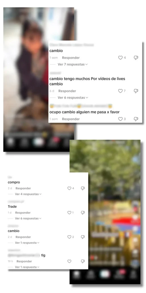 Otro patrón que detectamos en el algoritmo de Pepe es que la mayoría de los vídeos recomendados, tanto los de menores reales como creados con IA, tenían comentarios promocionando cuentas de Telegram que venden o intercambian pornografía infantil real. Es el caso de una publicación que muestra a una niña jugando con adornos navideños y que tiene 1,4 millones de visualizaciones, donde encontramos varios mensajes que decían “cambio”, un término que usan estas cuentas para referirse al intercambio de pornografía infantil que suele suceder a través de Telegram. Lo mismo con otro vídeo que muestra a una niña pequeña en traje de baño jugando en un parque con más de 655.000 visualizaciones, donde encontramos más comentarios de este tipo (“cambio”, “cambio y vendo” o “tlg [Telegram]”, por ejemplo). Así, el mismo algoritmo de TikTok pone a Pepe, que podría ser un pedófilo, a sólo unos clics acceder a pornografía infantil.