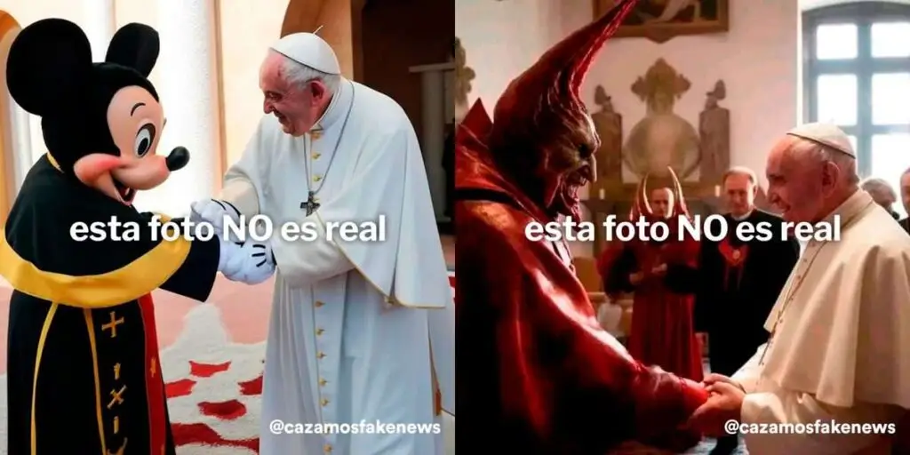 A primera vista, fotos como la del Papa Francisco estrechando la mano de un demonio o abrazando a Mickey Mouse sólo parecen tener fines de entretenimiento y sátira. Mientras que fotografías como las de Nicolás Maduro, no parecen más que ejercicios creativos.