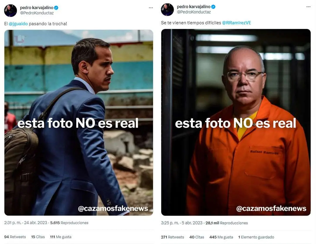 Por ejemplo, las imágenes de Nicolás Maduro que ilustran este artículo forman parte de un conjunto de no menos de 20 imágenes de personajes venezolanos generadas con IA por Pedro Carvajalino, representante del portal desinformativo Venezuela News. Entre las imágenes publicadas por Carvajalino en su cuenta de Twitter resaltan las del presidente de Venezuela, así como algunas del exministro de Petróleo, Rafael Ramírez o del líder opositor Juan Guaidó en contextos favorables a las narrativas del gobierno de Maduro.