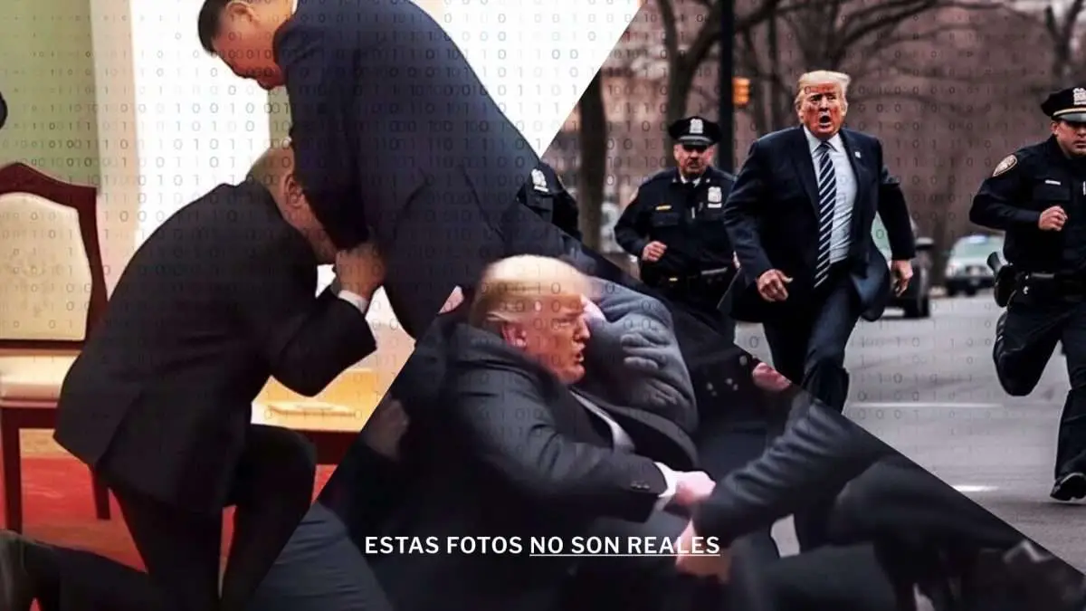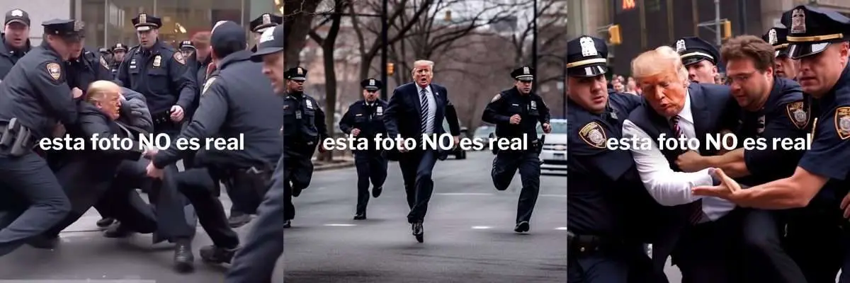 Un set de varias imágenes del ex presidente norteamericano Donald Trump siendo arrestado también está siendo compartido en las redes sociales. En todas las imágenes se ve a la figura de Donald Trump forcejeando con supuestos policías que intentan detenerlo, corriendo para escapar de ellos y hasta siendo enjuiciado.