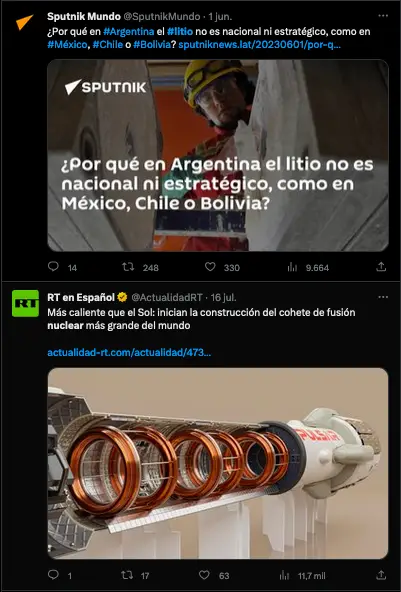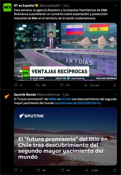 Por otra parte, tanto los contratos de la central nuclear como los de la explotación de litio han sido mencionados recurrentemente por las versiones en español de los medios de propaganda rusa Actualidad RT y Sputnik en el último año. Las cuentas de Twitter de estos dos medios han mencionado alguno de los dos temas por lo menos 96 veces desde el 18 de julio de 2022, como esta alianza encontró a través de un análisis con la herramienta Meltwater. Los tweets enlazan a artículos o videos producidos por estos medios que a veces simplemente reportan la firma de un nuevo contrato, pero que en otras ocasiones parecen promocionar a Rosatom y a sus subsidiarias.