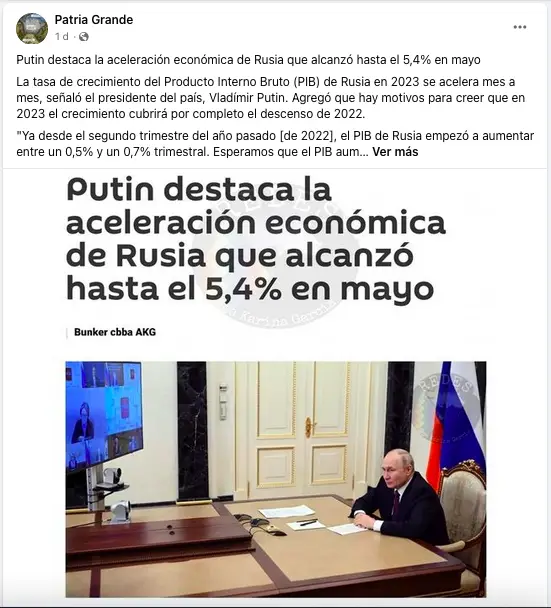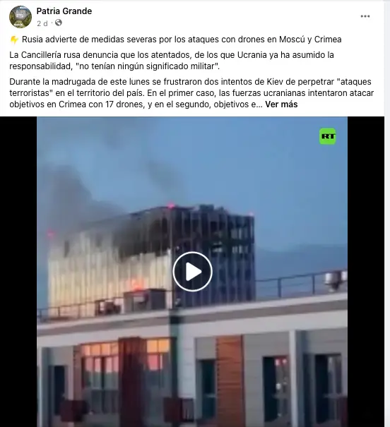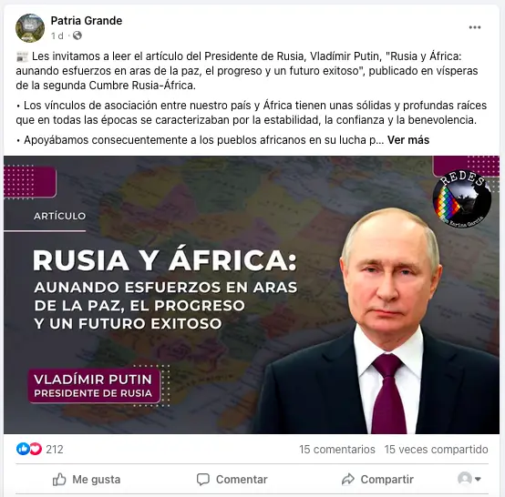 Uno de los posts más populares en Facebook, con más de 1.000 reacciones, que referencia la información fue publicado por la página Patria Grande. Según Facebook, sus cinco administradores viven en Bolivia. La página se dedica a publicar contenidos pro Kremlin, incluidos muchos artículos de RT.