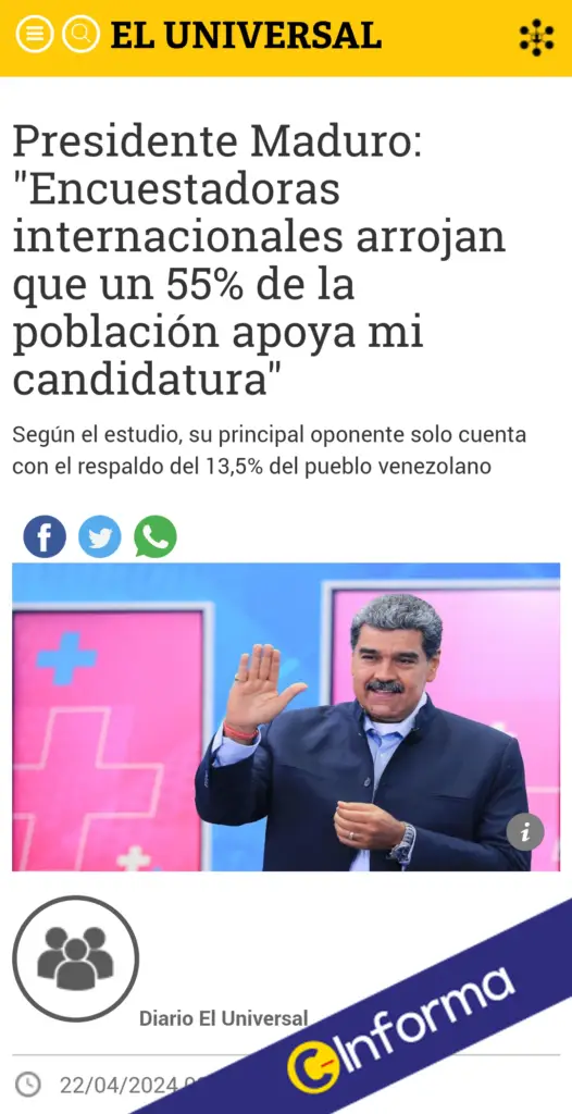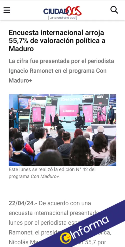 “Ahí tenemos en pantalla unos números de una reciente encuesta que ha traído el profesor Ramonet y que ha circulado por medios de comunicación y portales internacionales. Esa encuesta, yo te podría decir, es una radiografía del punto de partida, aún queda mucha campaña. ¿Qué demuestra esa y otras encuestas que son científicas, serias, de carácter internacional? Que el chavismo es una fuerza viva, activa, que está unificada…”, expresó Maduro sobre el sondeo que se transmitió en vivo por los canales estatales Venezolana de Televisión (VTV) y TVES, ambos adscritos al Ministerio del Poder Popular de la Comunicación y la Información y que forman parte del aparato comunicacional del gobierno en su hegemonía comunicacional, como lo definió el politólogo venezolano Ramón Cardozo, además de otras fuentes.