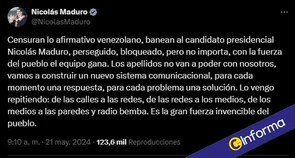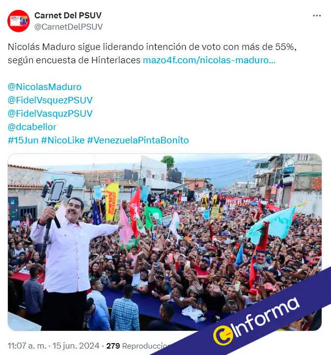 Esta misma etiqueta, #NicoLike, se utilizó junto a los datos de Hinterlaces en una publicación de una cuenta en X del PSUV, que también enlaza a la página del programa de televisión de Diosdado Cabello (Con el Mazo Dando), desde la cual se citan los datos de dicha encuesta.