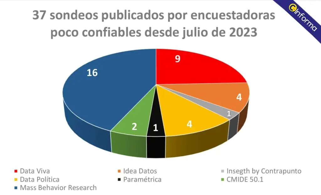 Leyenda: Hasta el cierre de esta publicación, el 24 de junio de 2024, se habían registrado 37 encuestas publicadas por las siete encuestadoras bajo la lupa. Fuente: Monitoreo y base de datos C-INFORMA 2024
