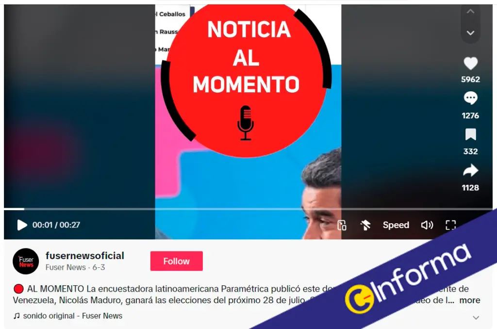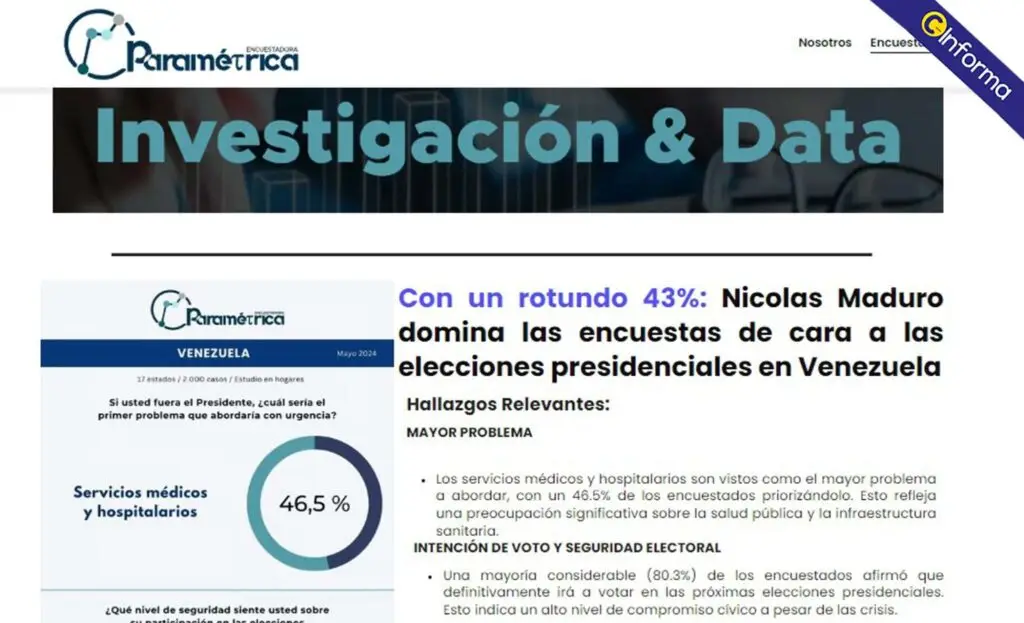 Por otro lado, la encuesta realizada el 15 de mayo de 2024 por Paramétrica fue difundida el 2 de junio, bajo el titular “con un rotundo 43%: Nicolás Maduro domina las encuestas de cara a las elecciones presidenciales en Venezuela”, en su página web, justo encima de otros dos presuntos estudios sobre la aprobación del presidente de Estados Unidos, Joe Biden, y sobre la aceptación de la gestión de Nayib Bukele en El Salvador. Estos fueron colgados en su web en forma de nota de prensa, sin láminas estadísticas para consultar como en el caso de la encuesta sobre Venezuela.