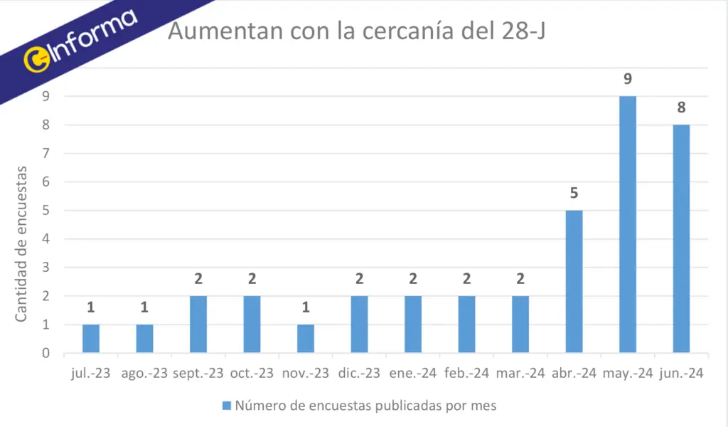 Desde julio de 2023 hasta el 24 de junio de 2024 se ha difundido, al menos, un sondeo de opinión electoral mensual, siendo Mass Behavior Research y Data Viva las que más estudios han realizado. En el último semestre de 2023, fueron las únicas que publicaron estudios de opinión, para un total de cinco.