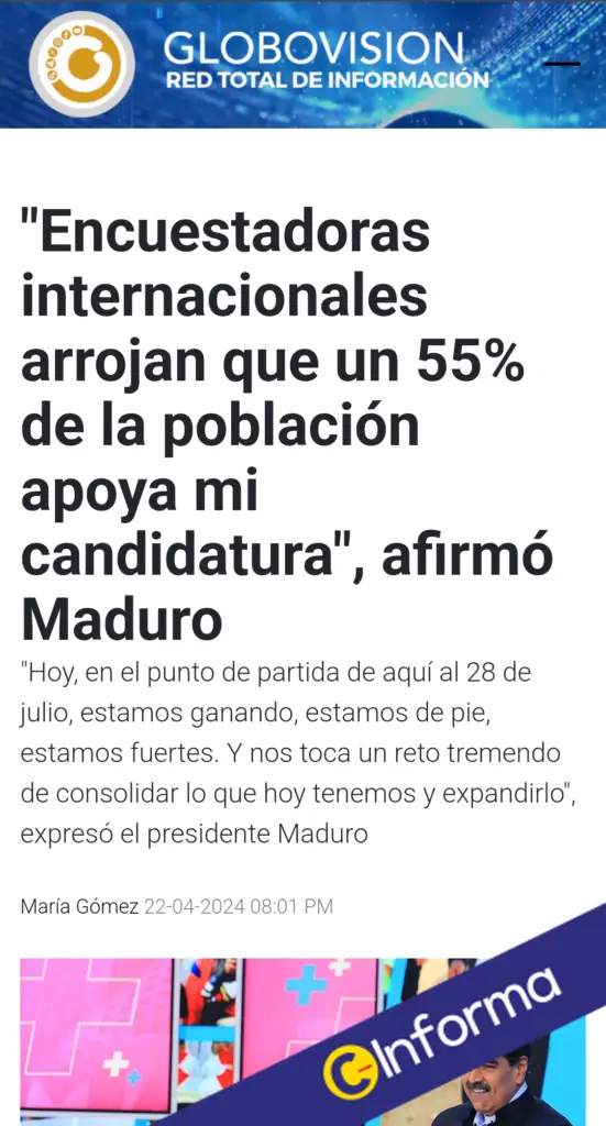 En este sentido, VTV utilizó los datos de la encuesta Paramétrica para asegurar que Maduro es “indoblegable” ante las elecciones del 28 de julio. Y Globovisión utilizó los resultados de Hinterlaces con datos que ubican a Maduro con el apoyo de 57,3% de los electores.