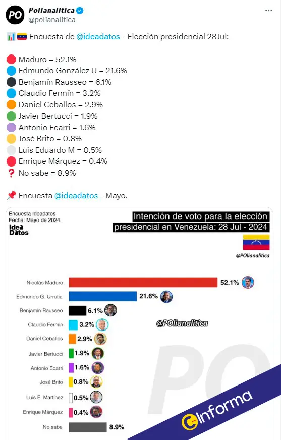 Desde marzo de 2023 hasta el 24 de junio de 2024, un total de 14 encuestadoras han divulgado más de 50 estudios de opinión relacionados a la elección presidencial. La Coalición Informativa C-INFORMA determinó que la información publicada por seis de estas firmas o presuntas encuestadoras, las cuales publicaron 37 sondeos durante el período, fue usada como parte de una estrategia para enrarecer el clima electoral y así desprestigiar a los candidatos de oposición al gobierno de Nicolás Maduro.