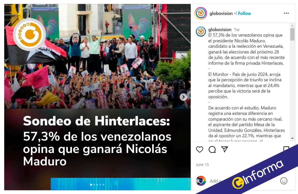 A través de esta búsqueda amplia también pudimos encontrar que algunos medios, como Globovisión en Instagram, no sólo están usando los datos de encuestadoras como Hinterlaces para posicionar una narrativa de apoyo masivo hacia Maduro, sino en algunos casos también para promover contenido vinculado a la “impopularidad” de perfiles de la oposición como Juan Guaidó, Leopoldo López, Henrique Capriles y Henry Ramos Allup. Asimismo, Telesur en X ha utilizado las encuestas de Hinterlaces e IdeaDatos para promocionar la imagen de Maduro como un candidato que contaría con más del 50% de apoyo electoral.