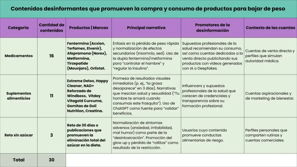 Esto ha facilitado la circulación de contenidos desinformantes sobre productos que construyen y refuerzan narrativas de delgadez como ideal estético, cuyo objetivo central es promover su consumo sin advertir sobre efectos secundarios ni riesgos a la salud.