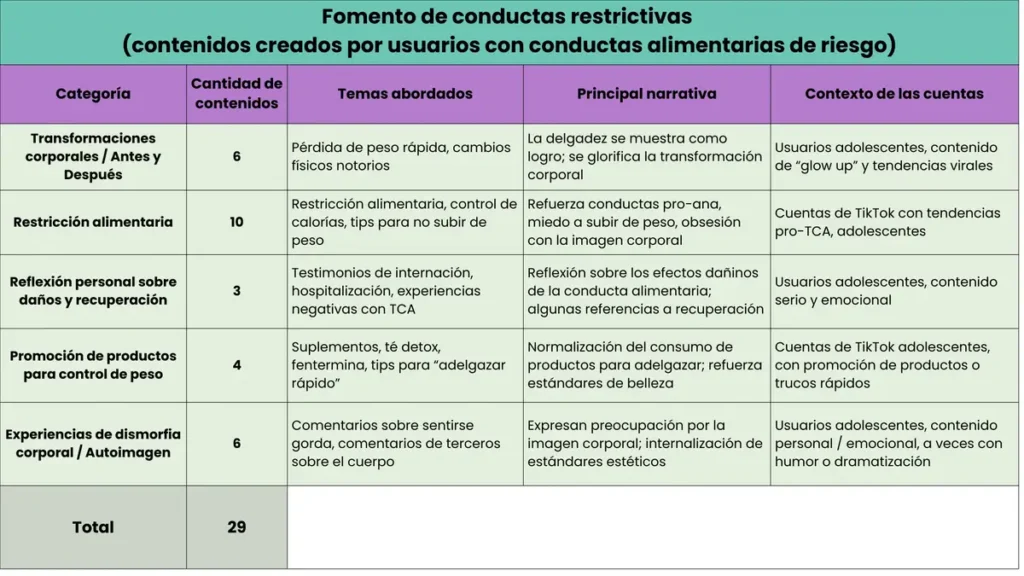 A través del análisis de los contenidos se identificaron mensajes que promueven conductas alimentarias de riesgo, sustentados en discursos que exaltan el “logro” de haber bajado de peso o el sacrificio necesario para conseguirlo.