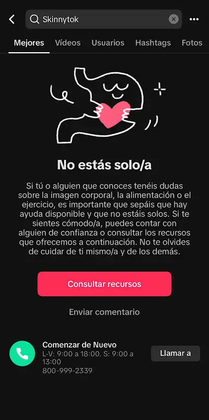 Para ofrecer otras soluciones, desde 2021 TikTok trabaja de la mano de Comenzar de Nuevo, una asociación civil con más de 26 años dedicada al tratamiento multidisciplinario de TCA en México y otros países de América Latina, quien además de colaborar en la identificación de contenido de riesgo, gestiona la única línea de ayuda a quienes realizan búsquedas relacionadas con trastornos de la conducta alimentaria en la región.