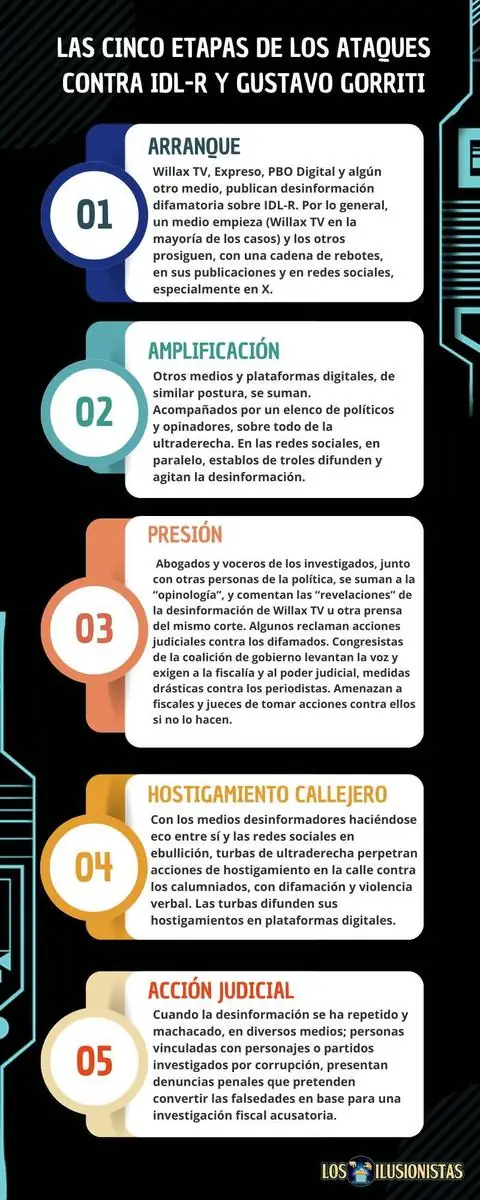 - Arranque: Willax TV, Expreso, PBO Digital y algún otro medio, publican información falsa sobre IDL-R. Por lo general, un medio empieza (Willax TV en la mayoría de los casos) y los otros prosiguen, con una cadena de rebotes, en sus publicaciones y en redes sociales, especialmente en X.