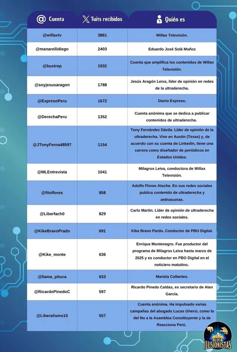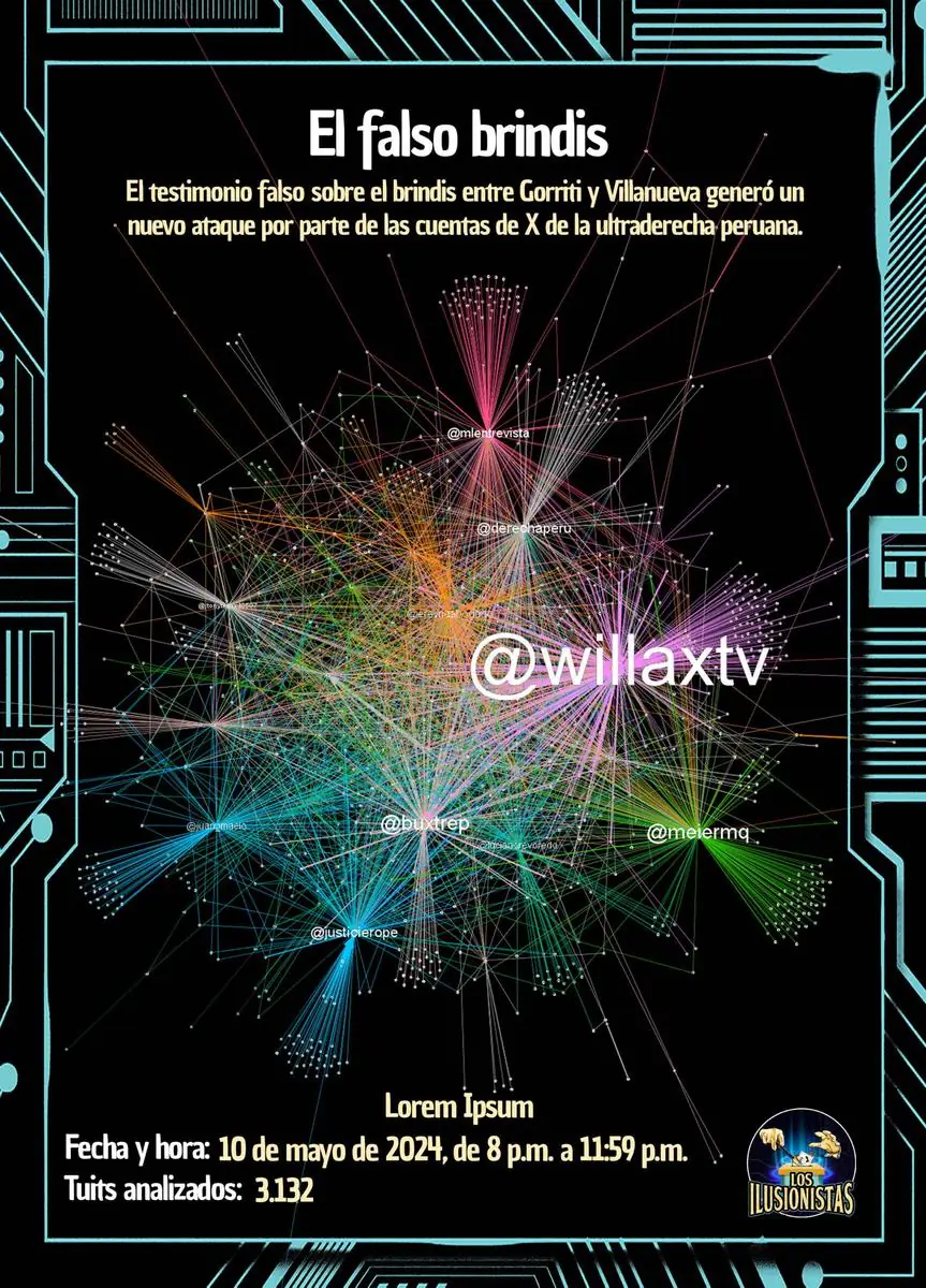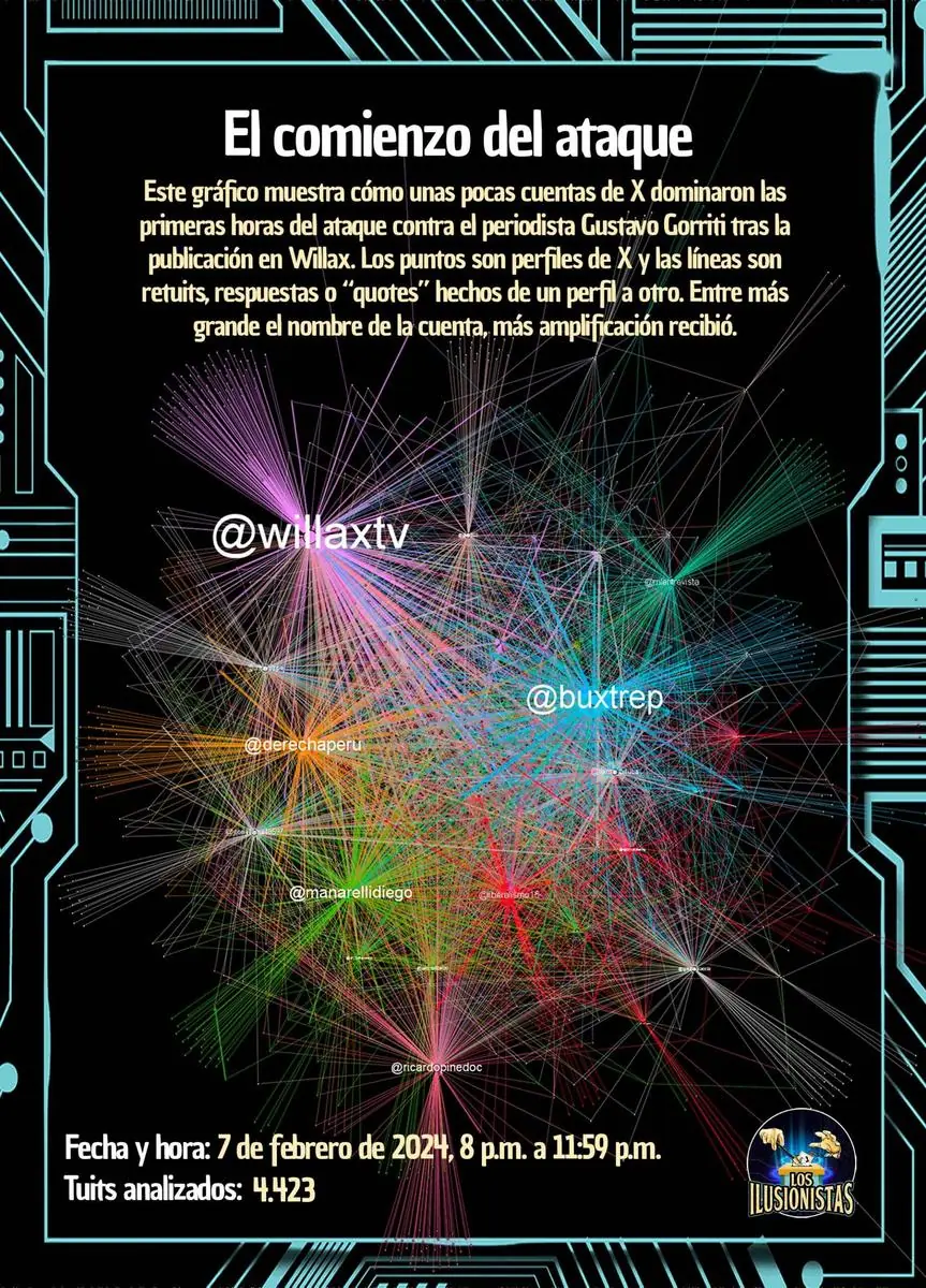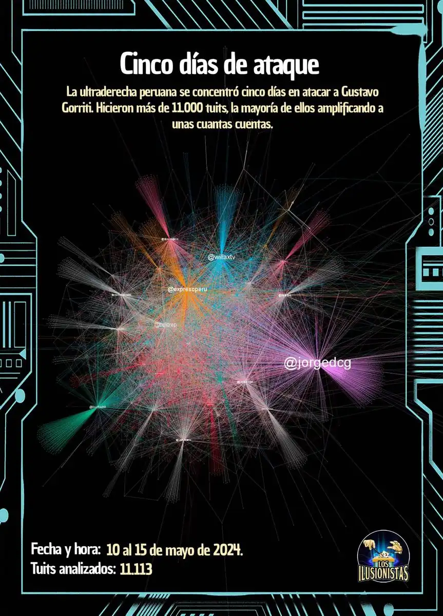 En las primeras cuatro horas tras la publicación del arranque de Willax —es decir, hasta la medianoche del 10 de mayo— 107 cuentas hicieron 3,132 tuits. Un 88% son retuits, y solo un 3,5% son trinos originales. En total, 1,156 cuentas publicaron al respecto ese día en X, y las más activas comparten las mismas características que hacen sospechar que se trata de perfiles inauténticos (no corresponden a opiniones originales de personas reales): usan nombres y avatares genéricos y se dedican exclusivamente a difundir mensajes de la ultraderecha peruana, sin referirse a ningún otro tema. La totalidad de esas cuentas, además, siguen activas hoy, un año y medio después de los hechos.
