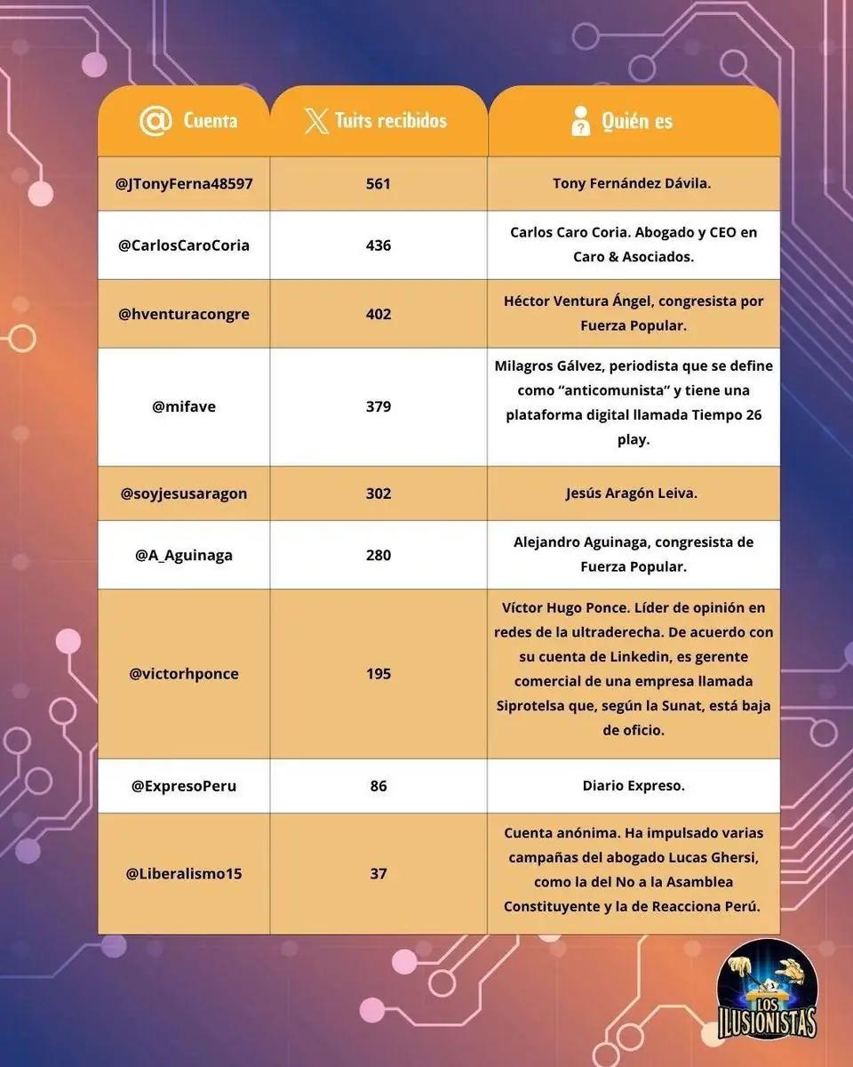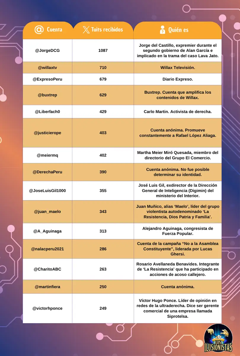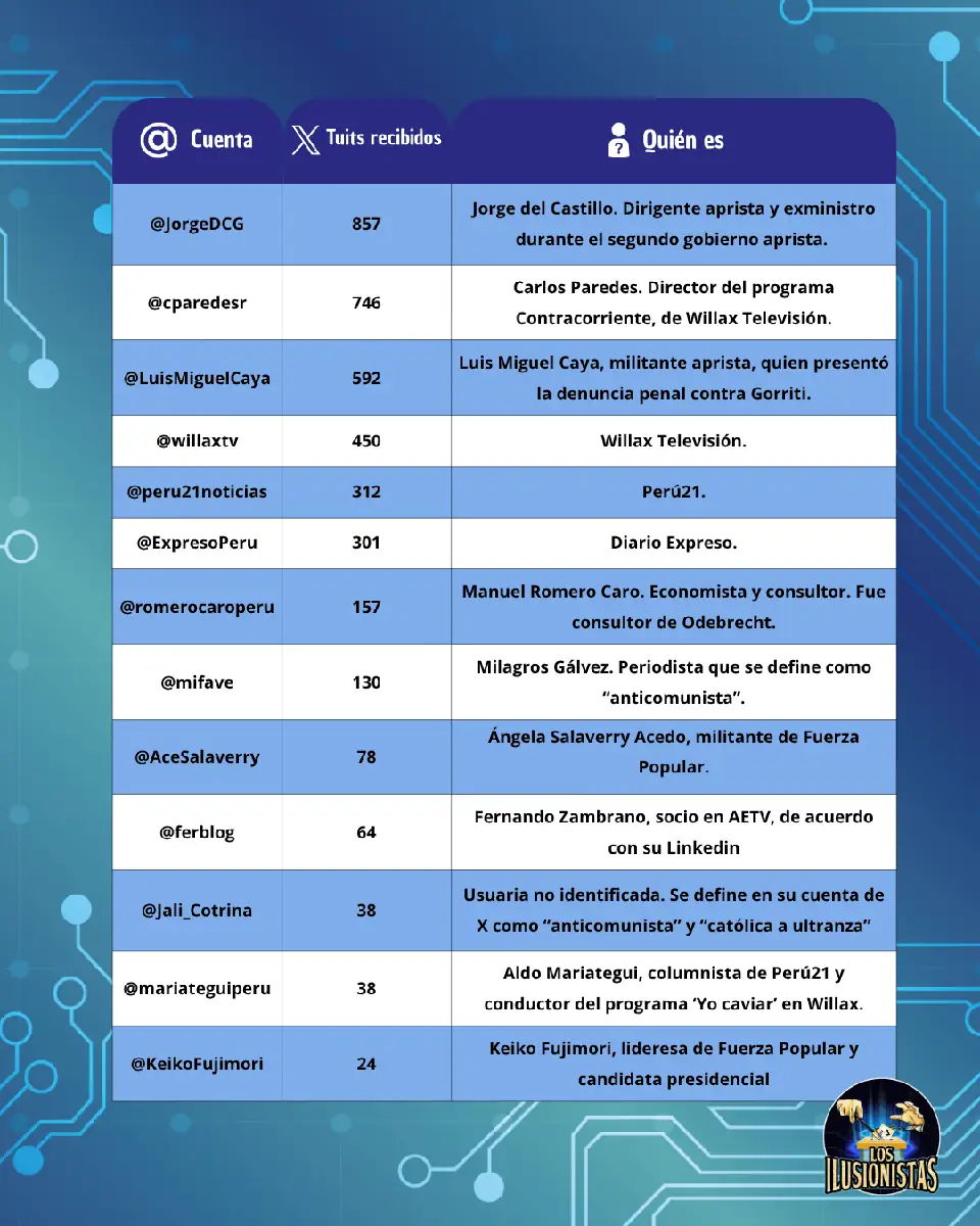 Las cuentas que más difundieron las presiones para actuar contra Gorriti son una combinación de políticos y abogados, personas con cuentas a veces anónimas y otras no, que tienen vínculos con Fuerza Popular y los movimientos violentistas.