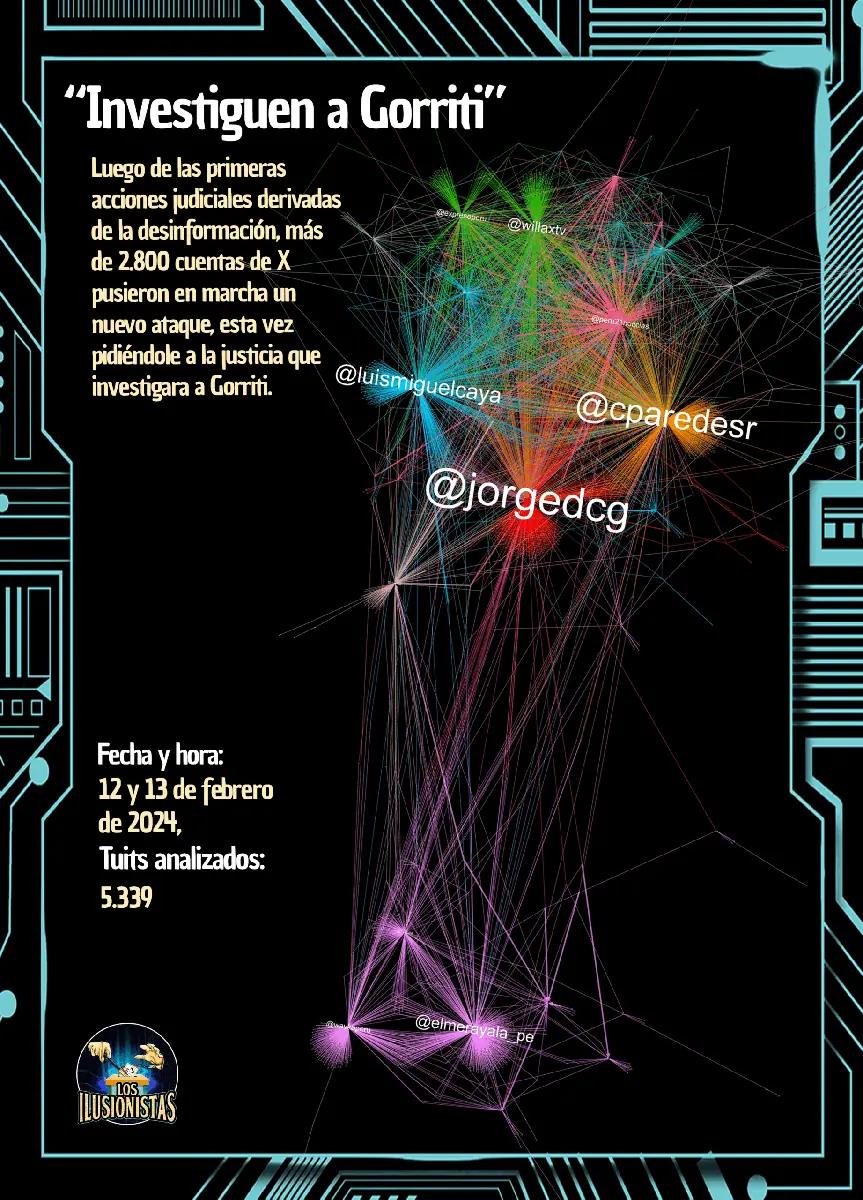 Pocas personas republicándose y citándose entre sí crearon la sensación artificial de representar la opinión pública en las redes peruanas. Así, 77 de las cuentas que participaron en el revuelo que siguió a la declaración de Villanueva en los días 8 y 9 de febrero presionaron para “investigar”, “procesar” o “actuar” contra Gorriti, publicando 2,818 tuits.