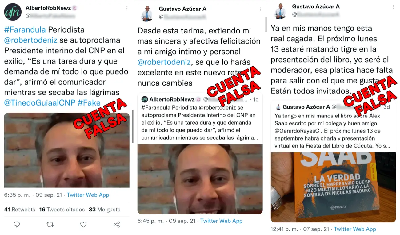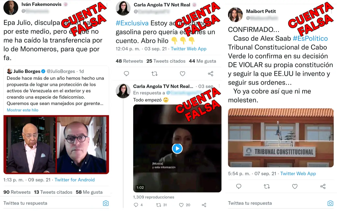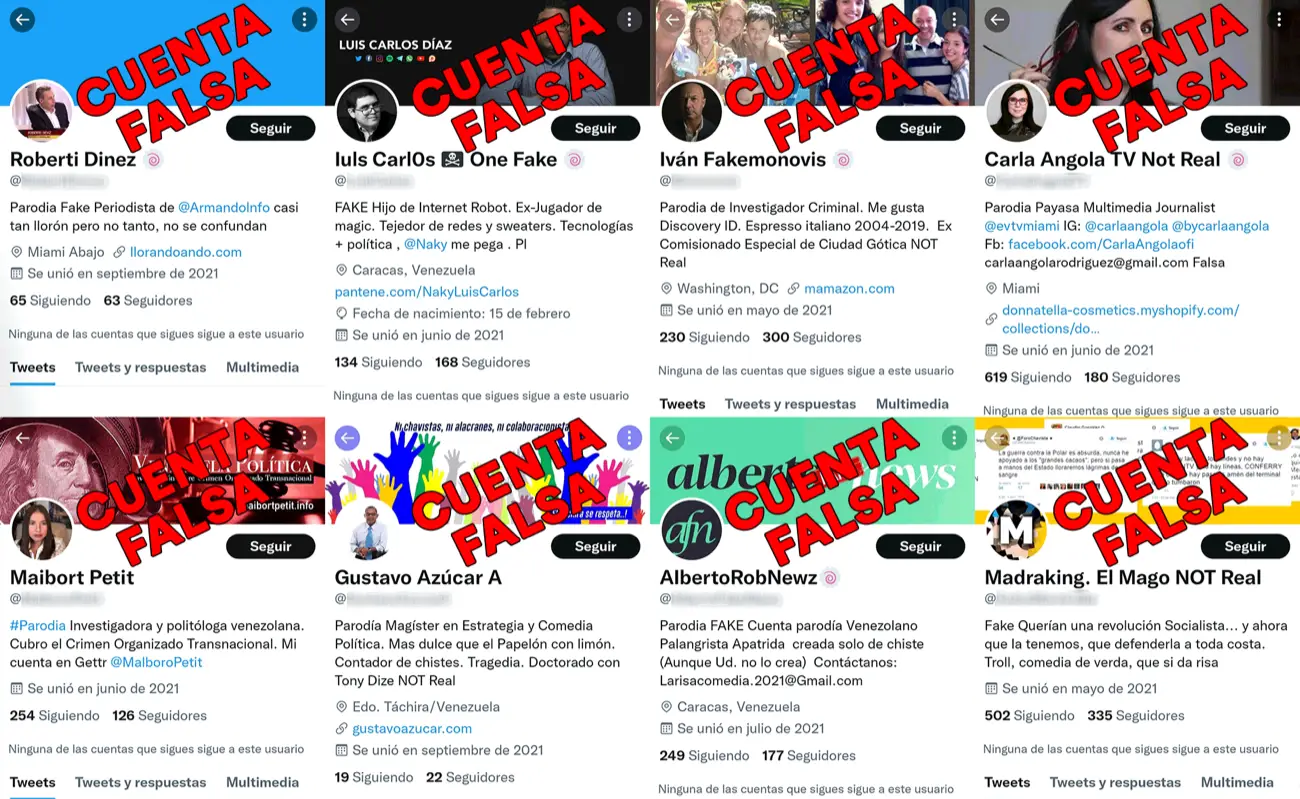 Desde mayo de 2021 han aparecido varias cuentas falsas que suplantan la identidad de periodistas, medios y tuiteros venezolanos influyentes. Aunque son presentadas como cuentas «parodia«, fueron creadas con el objetivo de amplificar narrativas favorables a Alex Saab, detenido en Cabo Verde, acusado de fraude por Washington y que enfrenta un proceso judicial que podría implicar su extradición a Estados Unidos.