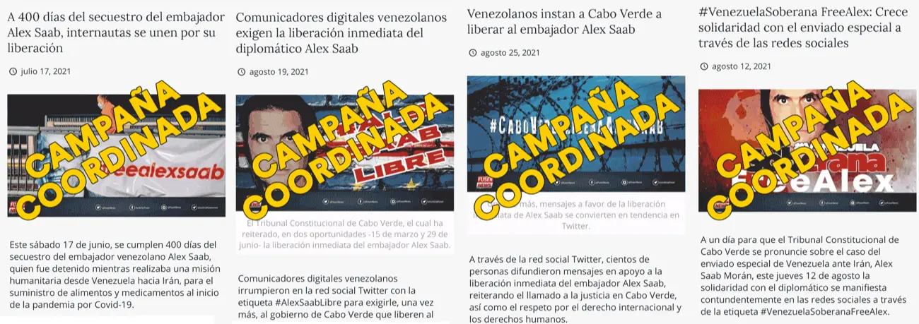 - La creación de páginas web que publican constantemente contenido favorable a Alex Saab y que ocasionalmente publican desinformación sobre su caso