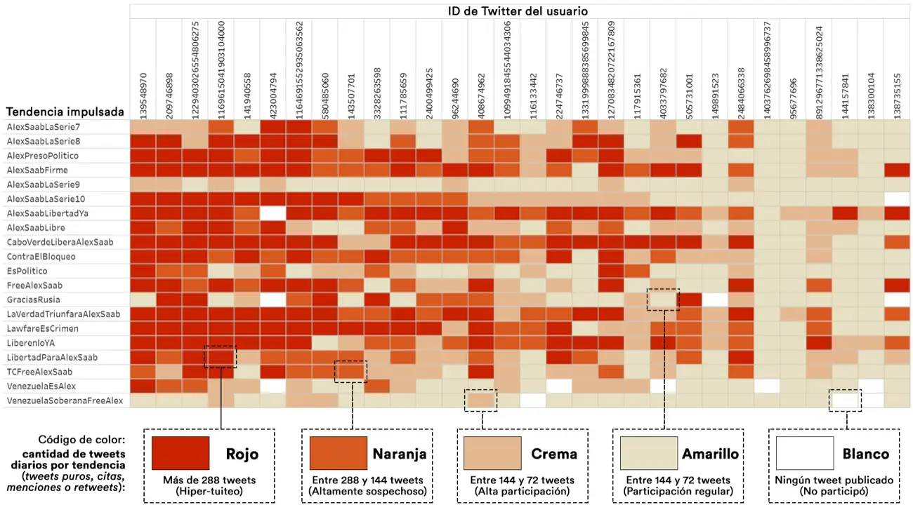 Cada una de las casillas de color naranja indica que el usuario publicó más de 144 tweets impulsando determinada etiqueta a favor de Alex Saab, un comportamiento «altamente sospechoso«, similar a bot (aunque impulsado por humanos, en este caso), según los criterios definidos por el DFRLab (Laboratorio Forense Digital del Atlantic Council) en este artículo. Las casillas de color rojo representan usuarios que publicaron más de 288 tweets, valor que entra fácilmente en la categoría de «hiper-tuiteo«, según el mismo artículo.