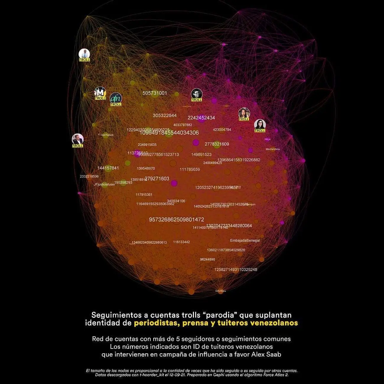 Determinamos que los tuiteros que más interactuaron con las cuentas troll «parodia» que suplantan la identidad de periodistas venezolanos, tuvieron una alta participación en el impulso de estas tendencias a favor de Alex Saab, porque forman parte de la misma red de cuentas venezolanas que las impulsa, de forma coordinada, mediante spam y a razón casi diaria: