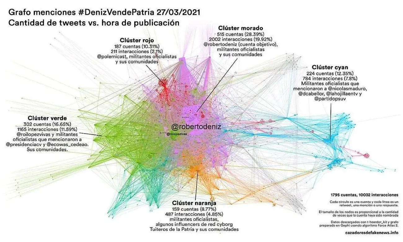 El 27 de marzo de 2021 detectamos que esta red de cuentas impulsó la etiqueta #DenizVendePatria en Twitter, otro ataque coordinado en contra del periodista, que detallamos en este hilo en Twitter y que quedó documentado con el siguiente grafo: