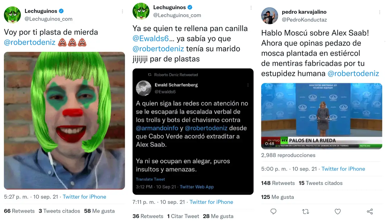 Entre las cuentas que atacaron a Deniz en esa ocasión, además de las que forman parte de la comunidad de astroturfing anteriormente señalada, se detectamos tweets de la cuenta de Lechuguinos, un portal venezolano que posee un largo historial de desinformación y la de Pedro Carvajalino (o Karvajalino), uno de los conductores del programa «Zurda Konducta», transmitido en el canal de Venezolana de Televisión, desde el cual se amplifica de forma constante, narrativas y propaganda favorables al régimen venezolano: