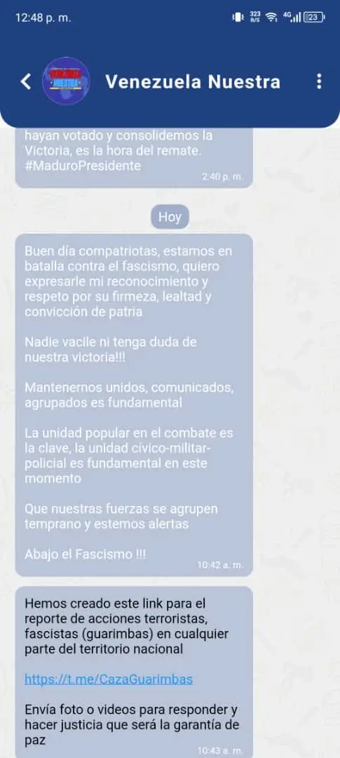 «Hemos creado este link para el reporte de acciones terroristas, fascistas (guarimbas) en cualquier parte del territorio nacional», decía el mensaje publicado en la app, seguido por el enlace al canal @CazaGuarimbas, que también pedía el envío de fotos o videos.