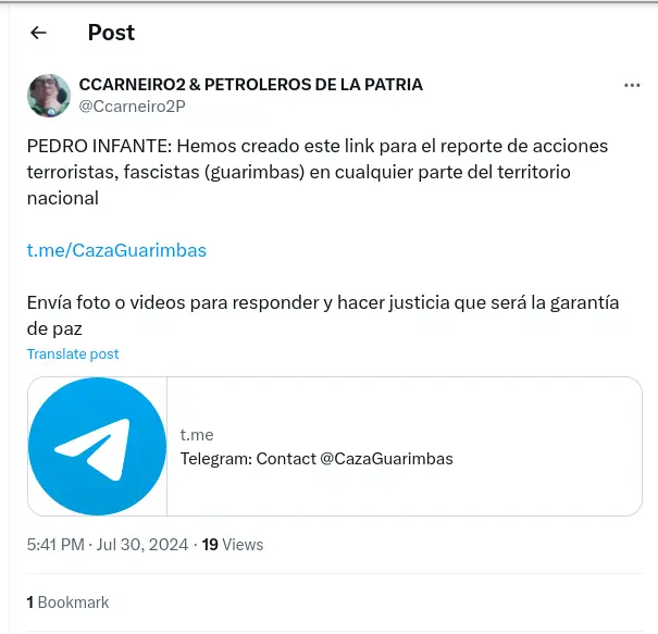 “Necesito que busquen en #telegram el grupo #CazaGuarimbas y lo denuncien. Están cazando a los que salen a manifestarse URGENTE!!!!”. Denuncias como esta se empezaron a viralizar en redes sociales desde el 30 de julio, mientras se veían a colectivos civiles progobierno en las calles, armados, aterrorizando a personas y dispersando actos públicos a balazos.