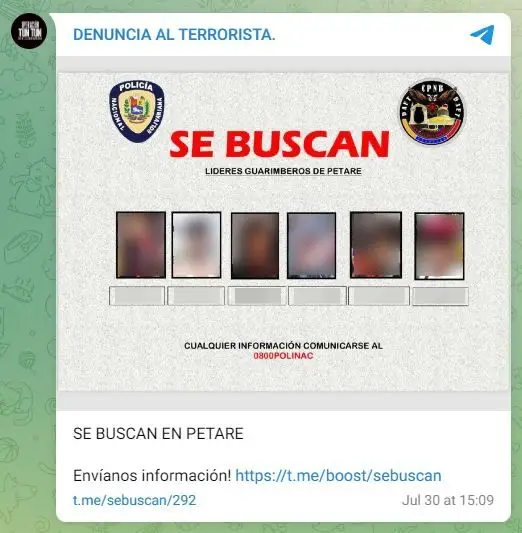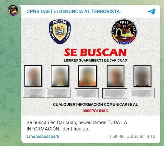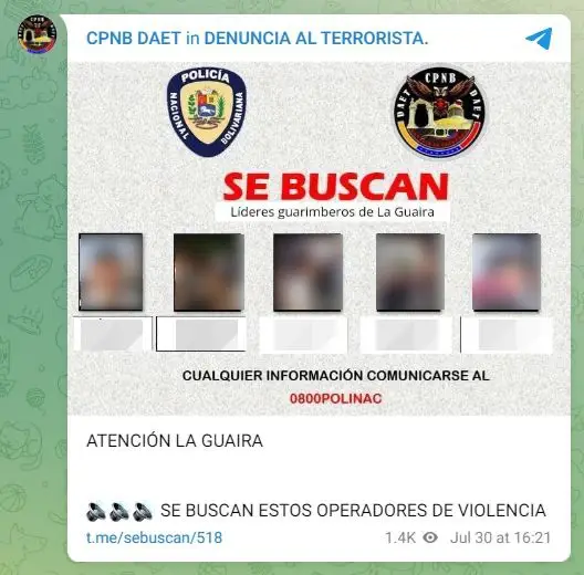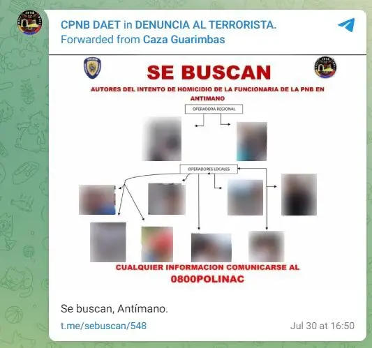La primera publicación en @CazaGuarimbas se hizo el 30 de julio de 2024 a las 01:11 a.m. hora de Venezuela y, en apenas segundos fue reenviada por uno de sus administradores a @CpnbDaet, canal oficial en Telegram de la Dirección de Acciones Estratégicas y Tácticas (DAET) del Cuerpo de Policía Nacional Bolivariana (CPNB).