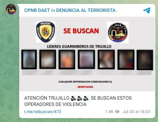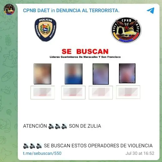 El 30 de julio, el canal oficial de la DAET, @CpnbDaet, asoció un grupo de discusión al canal, llamado @SeBuscan, que continuó recibiendo reportes sobre manifestantes en las calles, tal como se había venido haciendo con @CazaGuarimbas.