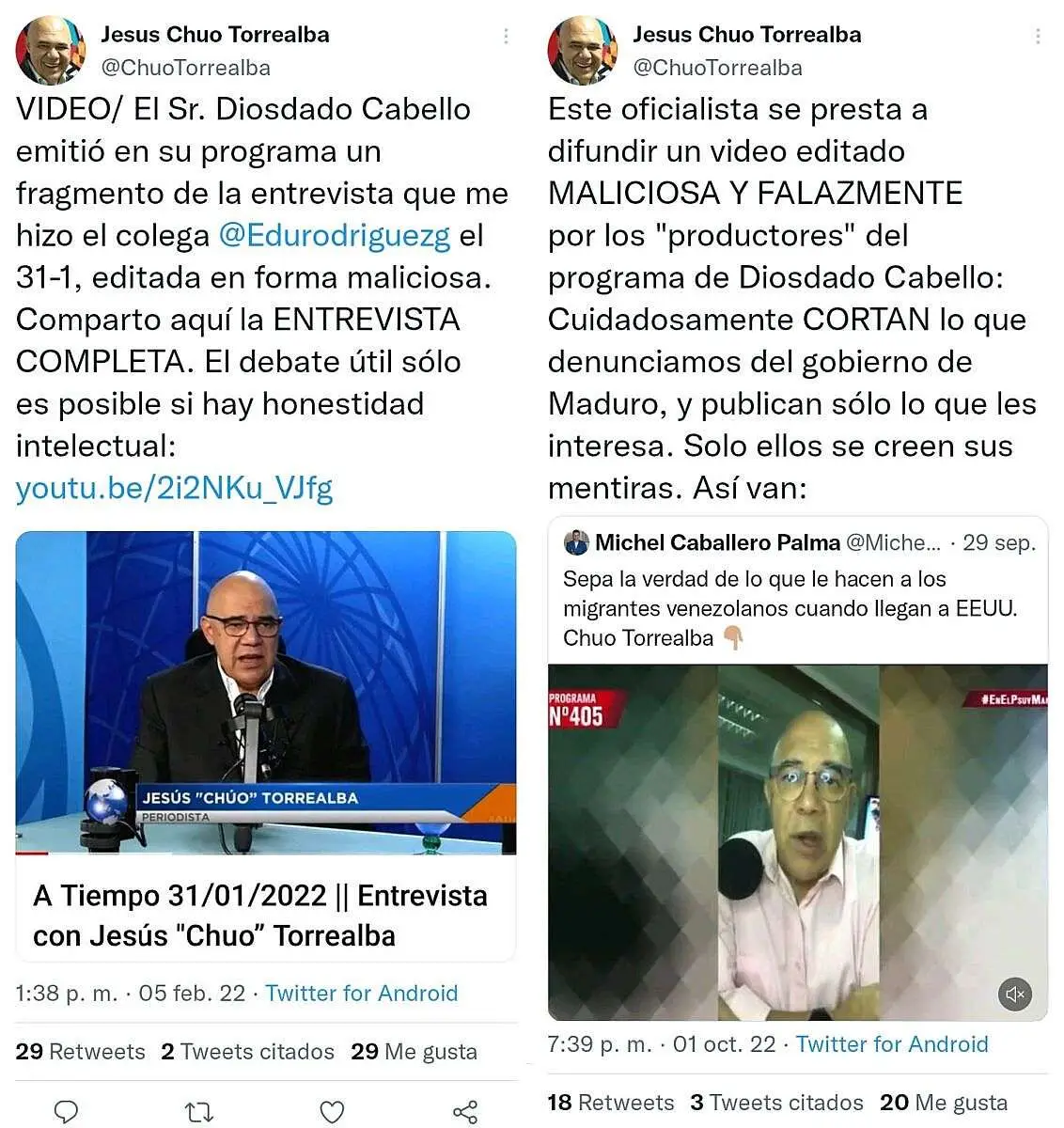 En el caso de Torrealba, al menos desde abril del presente, se transmiten versiones altamente editadas del editorial de su programa de radio, en una sección titulada «Camarada Chuo«. El presentador denunció en dos ocasiones anteriores, el 5 de febrero y el 1° de octubre de 2022, el uso de videos «maliciosa y falazmente» editados, que son transmitidos a través del programa de Diosdado Cabello.