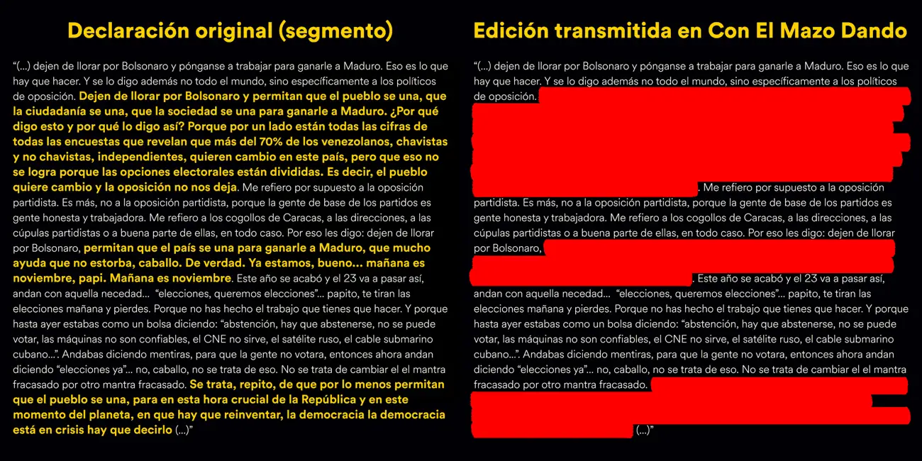 En su editorial, Torrealba repitió cuatro veces una frase que no aparece en la versión editada transmitida en VTV: “permitan que el pueblo se una” —expresión poco aprovechable en un programa de propaganda como Con el Mazo Dando— y que en tres ocasiones finaliza con la frase “para ganarle a Maduro”, un remate también suprimido de la versión transmitida en televisión.