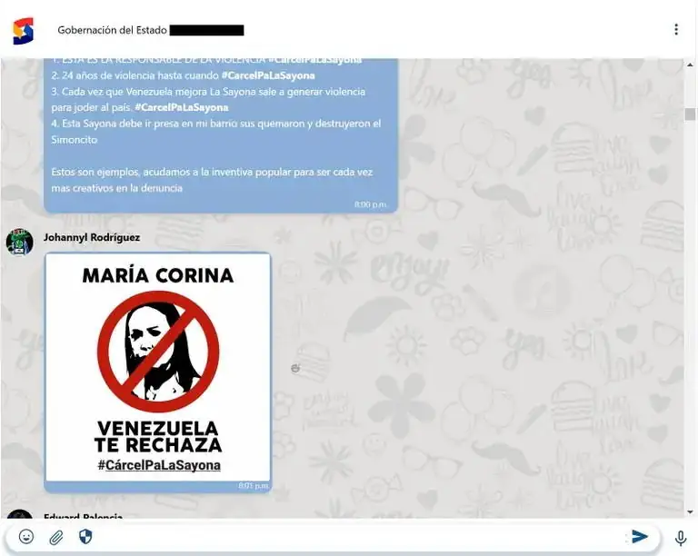 Varios mensajes posteriores fueron dedicados a ridiculizar a González Urrutia y a apuntar contra Machado. A través de Siscom se enviaron memes de Machado con su cara tachada con un círculo rojo, junto a la inscripción “María Corina, Venezuela te rechaza. #CárcelPaLaSayona”. El 9 de enero pasado, día en que Machado fue detenida momentáneamente y luego liberada, Rodríguez difundió el video de la opositora indicando que estaba a salvo y escribió: “Un falso positivo más, un show para tapar el fracaso. El fascismo ha sido derrotado en Venezuela”.