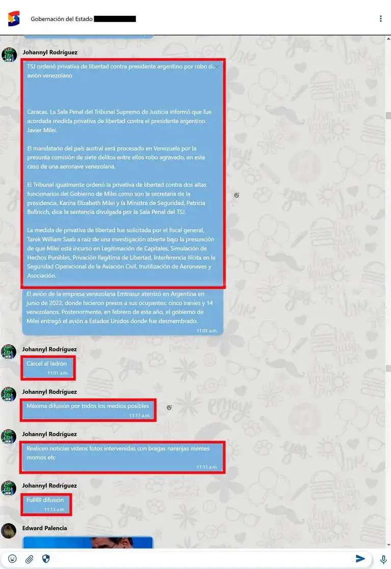 Cuando el Tribunal Supremo de Justicia (TSJ) de Venezuela emitió una orden de captura contra el presidente Javier Milei el pasado 19 de septiembre por el “robo” del avión venezolano-iraní que estuvo retenido en Buenos Aires desde 2022, un segundo operativo contra el mandatario argentino se activó en Caracas. Llegó desde los altos mandos del Ministerio del Poder Popular para la Comunicación e Información de Venezuela (Mippci) a través de un chat en una aplicación de mensajería manejada por el chavismo. Las directrices fueron claras: difundir en redes sociales el pedido de captura y escrachar al máximo al presidente argentino.